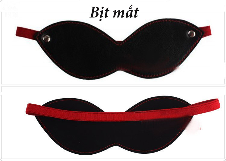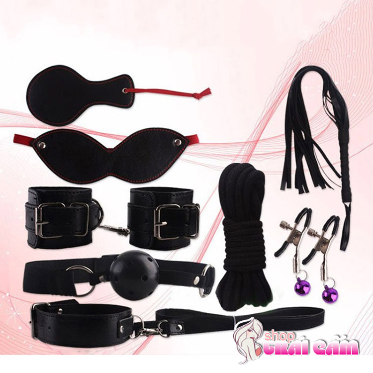 Bộ đồ chơi bao gồm 8 món: Bịt mắt, còng tay, khóa cổ, roi da, phết mông, khóa hàm, dây trói, kẹp ngực