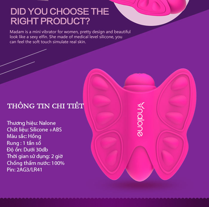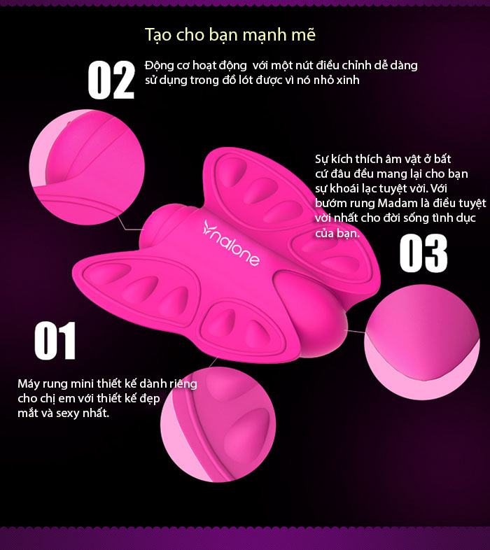 Với Bướm rung kích thích âm vật- Nalone Madam đem đến những điều ngọt ngào và thỏa mãn nhất dành cho nàng khi được kích thích khu vực âm vật - hạt le hay môi ngoài âm đạo làm nàng sướng rên, sướng tới điên đảo và hứng tình hơn bao giờ hết nếu để nàng kích thích trong màn dạo đầu.