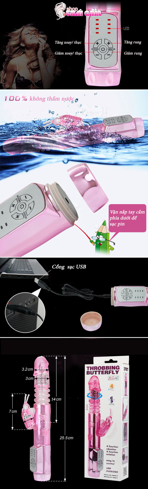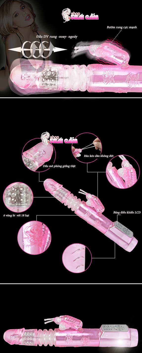được làm bằng silicon mềm mại, trên thân có nhiều vòng bi được sắp xếp xoay quanh trục giúp tăng ma sát thành âm đạo. Ngoài ra, đầu phụ có hình ngón tay rung với nhiều chế độ khác nhau chọc thẳng vào mồng đốc làm cho người phụ nữ sung sướng cực độ. Dương vật giả thụt tự động sạc pin với cổng USB, chỉ cần bất cứ thiết bị nào có cổng USB được kết nối với dương vật giả là bạn có thể sử dụng thoải mái mà không sợ hết pin, tiết kiệm được chi phí đáng kể cho bạn. sản phẩm có thể sử dụng tới trên 1h liên tục.