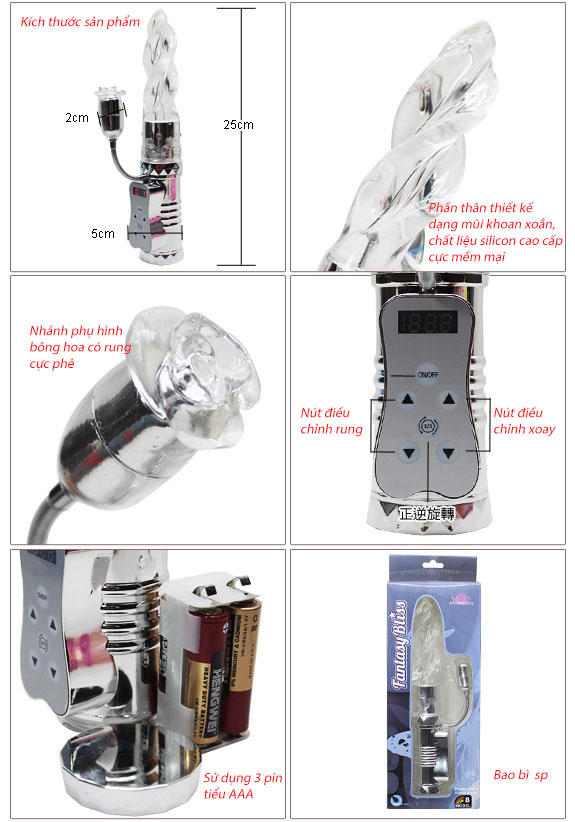 Chức năng: rung, xoắn, xoay (16 chế độ rung và 8 chế độ xoay)