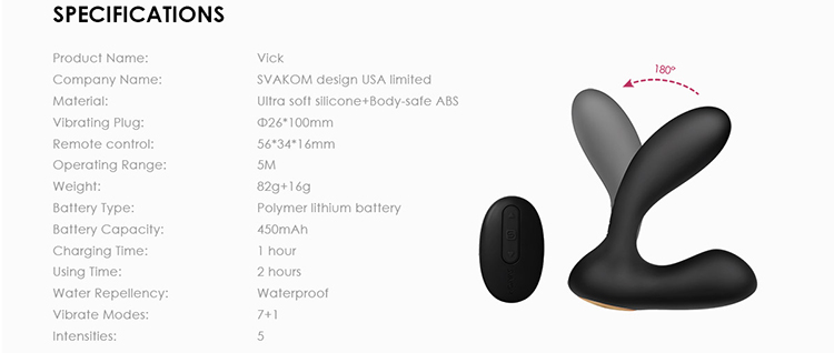 Svakom Vick máy mát xa hậu môn rung đa điểm điều khiển xa thuộc dòng máy mát xa cho nam vô cùng mạnh mẽ và sang trọng. Máy rung được thiết kế đặc biệt cho các cặp vợ chồng kích thích trong khúc dạo đầu đầy hấp dẫn. Hai động cơ rung mạnh mẽ và riêng biệt cung cấp kích thích mạnh mẽ bên trong và bên ngoài. Nó thực sự hoàn hảo cho mát xa điểm G hay âm vật cho nữ hoặc mát xa hoàn hảo cho kích thích tuyên tiền liệt ở nam. Có thể sử dụng Svakom Vick với điều khiển từ xa thông minh nhằm tương tác cho các cặp vợ chồng hoặc không có điều khiển xa, nhưng lựa chọn thông minh nhất vẫn là sử dụng điều khiển xa để thay đổi chế độ và cường độ rung khi bạn sử dụng một mình.
