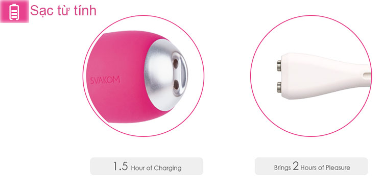 Pin sạc từ tính có thể sạc lại nhiều lần giúp chị em tiết kiệm khá nhiều chi phí cũng như thời gian thay pin. Nó có thể sạc đầy trong 1.5 giờ và sử dụng trong khoảng 2 giờ, tất cả sản phẩm của svakom phải được sạc bằng bộ chuyển đổi điện áp/ dòng điện đầu ra 5V/ 1A