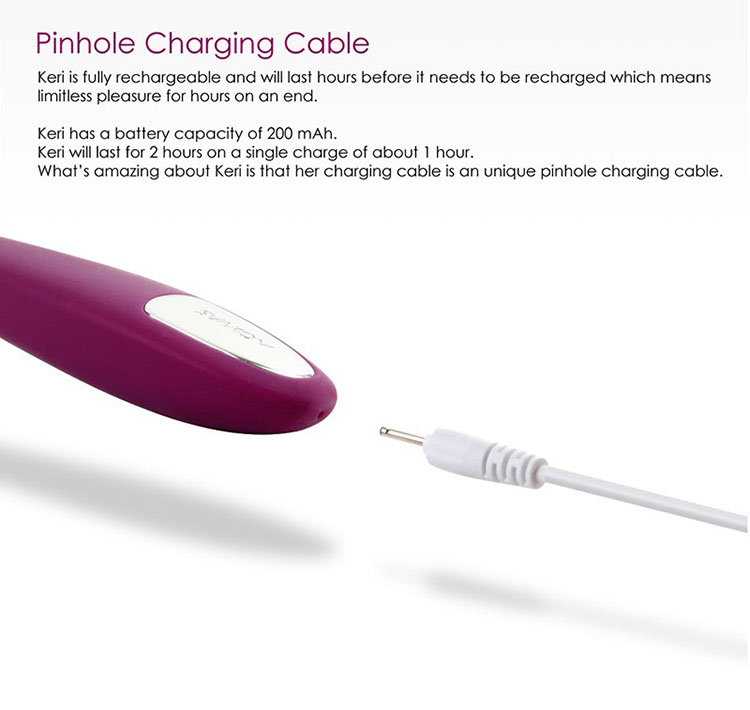Máy rung điểm G cao cấp nhỏ xinh Svakom Keri- Ngón tay đam mê là thiết kế mới nhất cho kích thích âm vật và điểm G của SVAKOM. Keri là một máy massage âm vật siêu mạnh mẽ bao phủ một lớp silicon mềm mịn đặc biệt lành tính cực kỳ an toàn, thân thiện với cơ thể và dễ dàng làm sạch với nước. Keri có 5 chế độ rung và 5 cường độ thay đổi tốc độ từ nhẹ nhàng tới vuốt ve, độ nhiệt tình siêu mạnh mẽ tới dữ dằn và dồn dập.