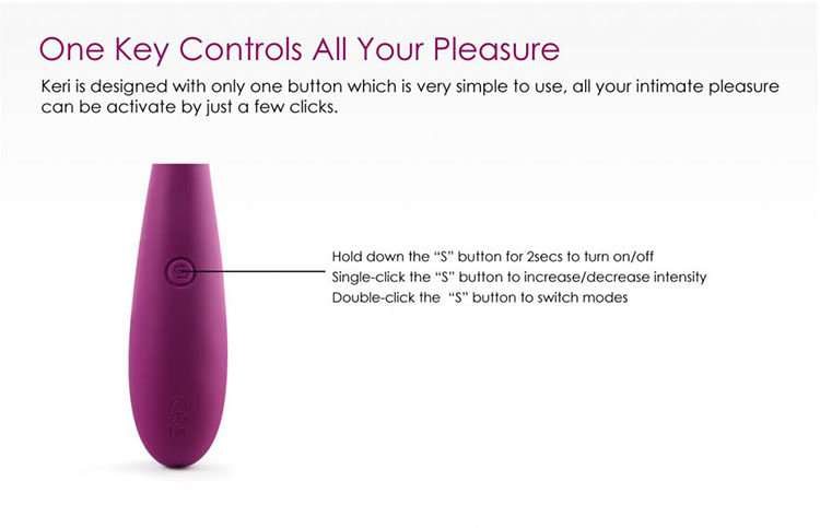 Thiết kế của keri với duy nhất một nút điều khiển cực đơn giản. Nhấn nút S 2 giây để bật/ tắt. Nhấn 1 lần vào nút S để chuyển đổi cường độ. Nhấn 2 lần vào nút S để chuyển chế độ rung.