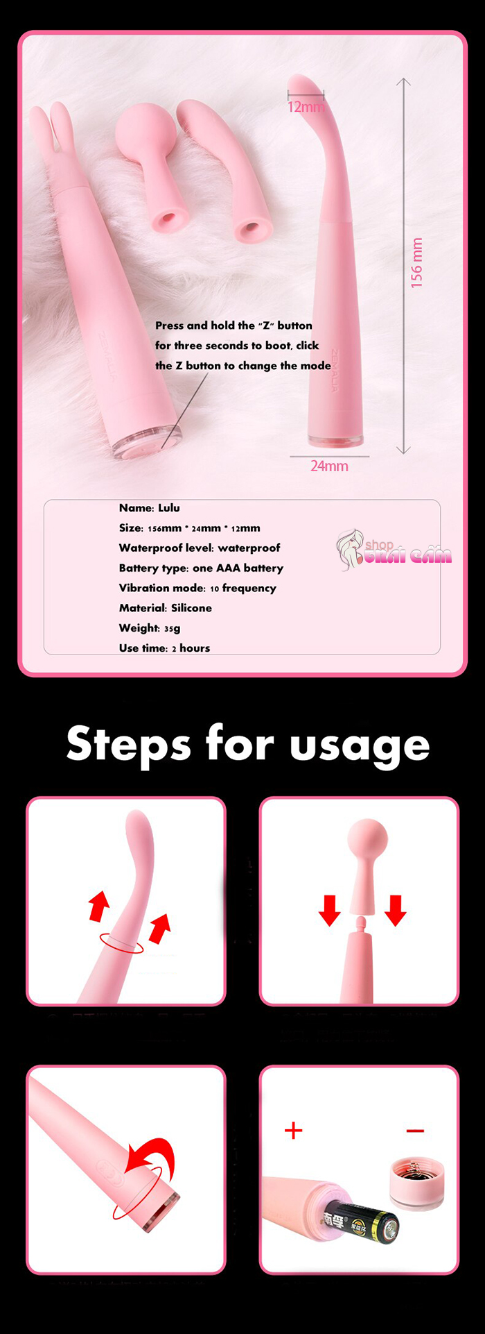 Điểm ưu nữa của sản phẩm là rung rất êm, khả năng gây ồn là không có. Lulu được sử dụng 1 pin AAA rất tiện lợi và dễ dàng tháo lắp. Sản phẩm được thiết kế chống thấm nước nên các bạn có thể sử dụng Lulu dưới vòi sen hay bồn tắm, 1 cảm giác cũng rất mới lạ và thú vị.