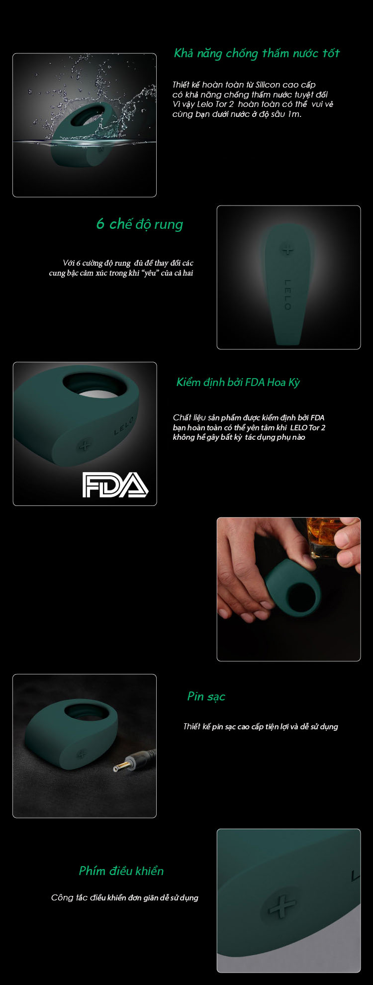 Lelo Tor 2 thiết kế hoàn toàn từ Silicon TPE cao cấp, không mùi có thể sạc lại và hiệu quả chống thấm nước 100%. Việc thiết kế với silicon mịn giúp cho người đeo có cảm giác thoải mái cũng như phù hợp với tất cả kích thước của các anh, nó thật sự mang lai sự dẻo dai cũng như sức bền bỉ "chiến đấu" cho các anh và cảm giác tuyệt vời cho các nàng cũng không kém. Thiết kế với phiên bản chống thấm nước ở độ sâu 1m, 6 chế độ rung kích thích luôn cung cấp cho bạn và người ấy những cảm giác ly kỳ, hấp dẫn trong chốn phòng the.