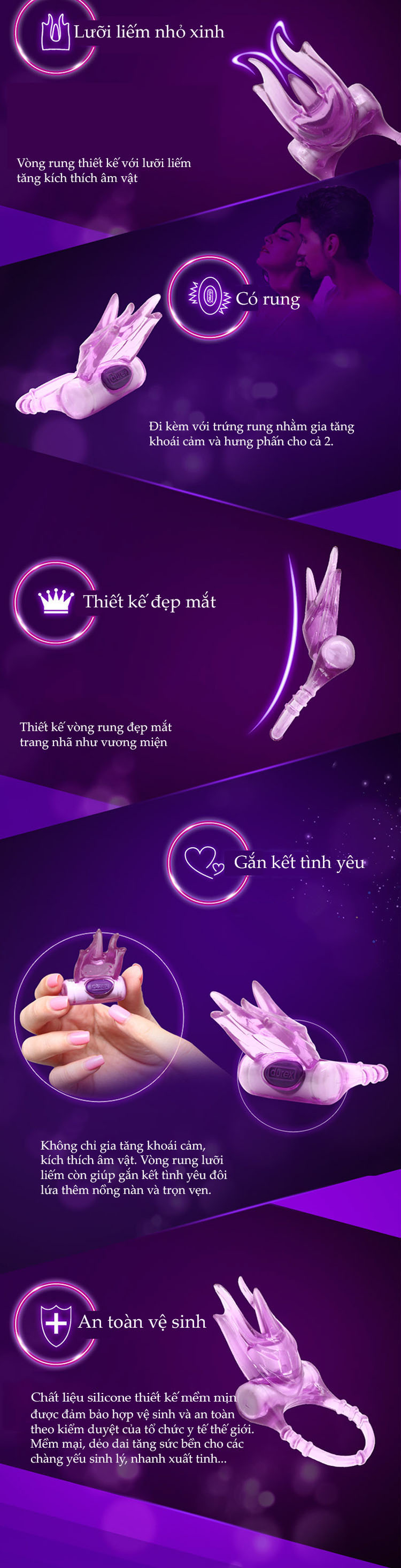 Vòng rung lưỡi liếm Durex Play Bliss sản phẩm giúp tăng cường khả năng tình dục bền bỉ cho nam giới đồng thời gia tăng khoái cảm và kích thích làm tình ở nữ giới. Vòng rung Durex thiết kế dạng nhẫn rung giúp nam giới tăng cường độ cương cứng, kéo dài thời gian nhằm kích thích đủ để có thể đưa bạn tình của các anh "về đích". Ngoài ra vòng rung durex còn có khả năng tăng kích thích âm đạo với lưỡi liếm nhỏ xinh thiết kế phía trên nhẫn rung. Chỉ cần một tần số rung nhẹ cũng dể làm tê tái chị em trong màn kích thích dạo đầu đầy hưng phấn và khoái lạc.